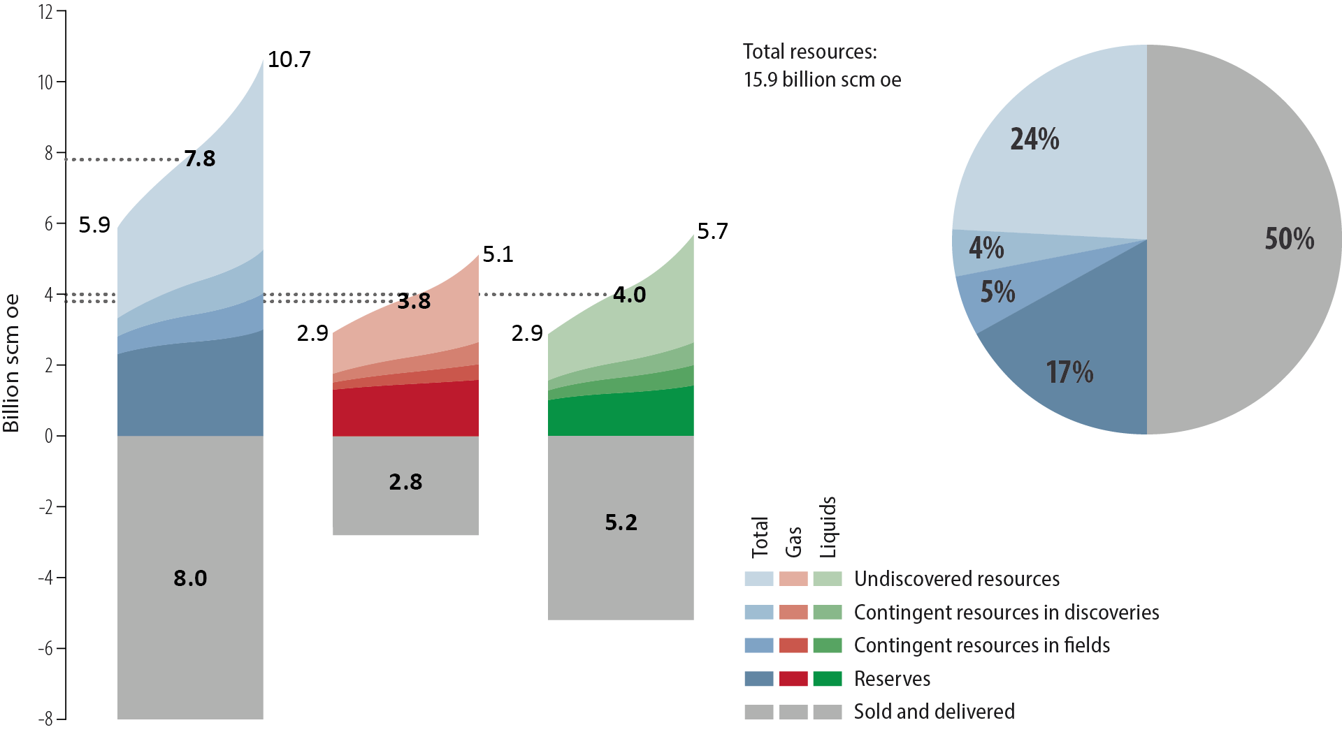 These amount to 666 million scm oe, which breaks down into 359 million scm liquids and 307 billion scm gas.
