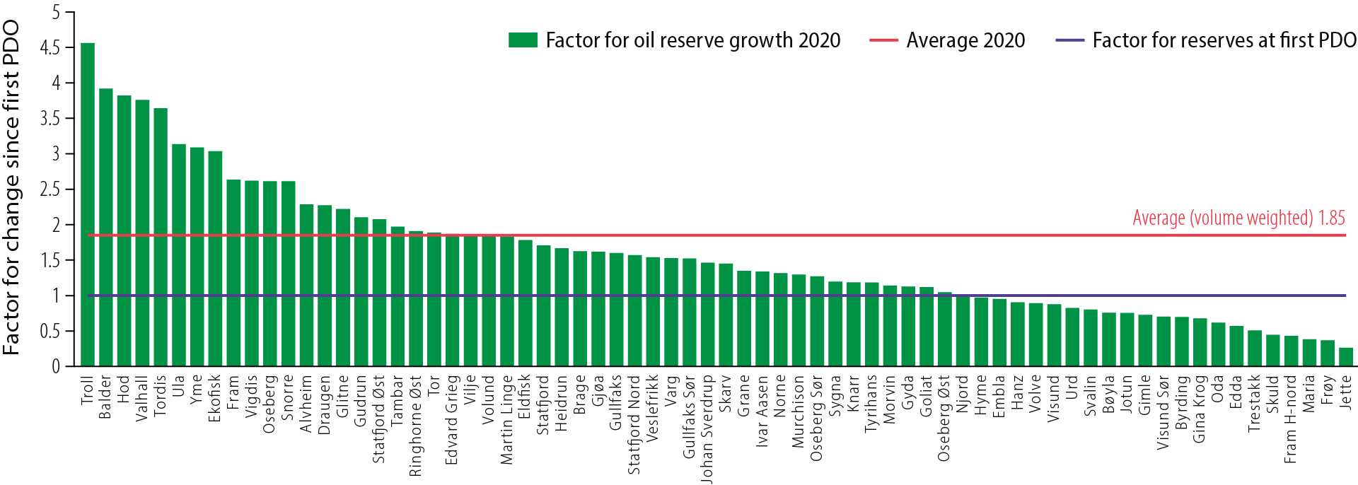 History shows that most of the big fields on the NCS have produced more and for longer than was assumed when they were developed. Figure 3.16 compares current oil reserves in fields with the figure given in the original PDO. A field with the bar extending above the blue line has had its estimated reserves upgraded – in several cases, by more than double. Those below the line have seen their estimate reduced, and are by and large small fields.